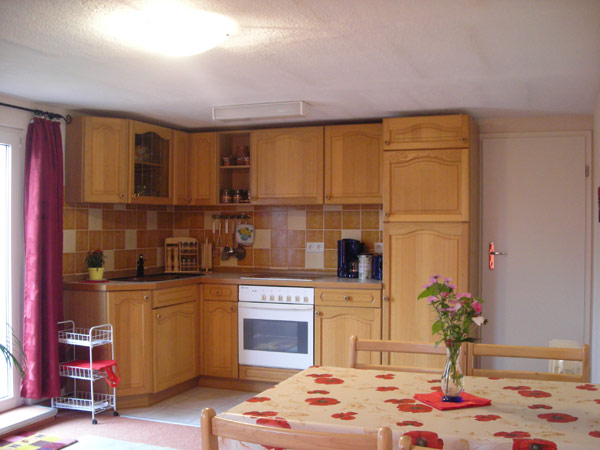 - offene Küche mit Ceranfeld, Backofen, Kühlschrank und Geschirrspüler